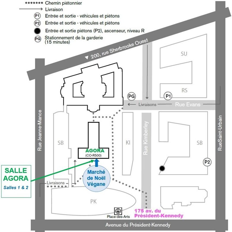 We are at 175 av. President-Kennedy, at the Agora Hall. The hall is located in the building just behind the Place-des-Arts metro station (exit Président-Kennedy). A few steps from the corner Président-Kennedy and Kimberley streets, you will see signs to the Agora hall. Follow the signs, which lead you to a walk path towards the venue. See dotted line on the map.